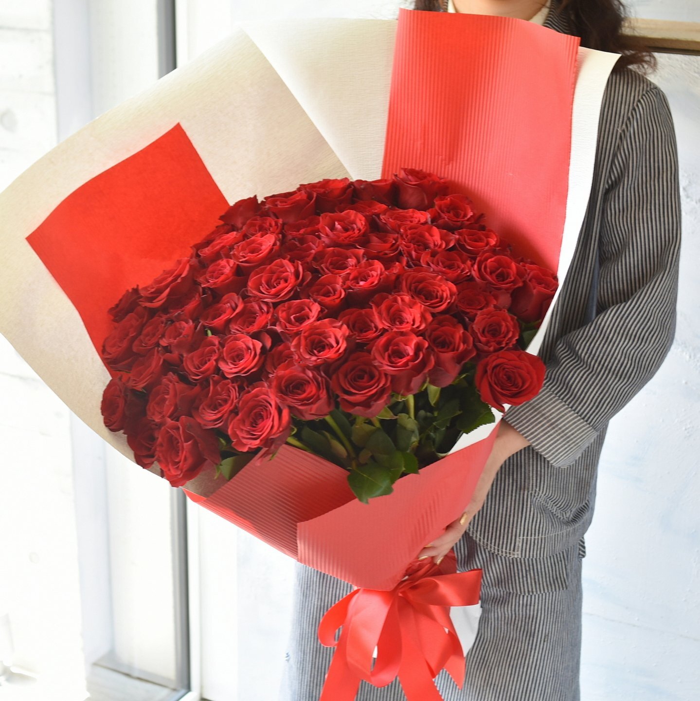 お好きな本数で花束 ご希望の本数を自由に選択していただけます。 下記の本数選択欄をスクロールし、ご希望の本数と価格を確認し、本数を選択ください。 12本から承ります。 本数を選択後、必要なオプションを選択し、カートへお進みください。 オプションが必要ない場合は、必ず「なし」をご選択ください。花束を素敵にラッピングしリボンを付けてお届けします。※配達用の箱はお渡しできません。ご自身で運ぶ場合は、オプションの花束固定段ボールをお求めください。 ※写真はイメージです。本数を正確に表しているものではございません。 ご希望の本数(12~108本まで)を お選びいただけます。 ※必須 - 12本 7,920円「私と付き合って、日ごとに愛が強くなる」「私の妻になってください」13本 8,580円「永遠の友情」14本 9,240円「誇りに思う」15本 9,900円16本 10,560円17本 11,220円18本 11,880円「誠実」19本 12,540円「忍耐と期待」20本 13,200円「私のひとひらの愛」21本 13,860円「あなただけに尽くします」22本 14,520円「あなたの幸運を祈る」23本 15,180円24本 15,840円「1日中思っています」25本 16,500円「あなたの幸せを祈っています」26本 17,160円27本 17,820円28本 18,480円「心からのプロポーズの証です」29本 19,140円30本 19,800円「ご縁があると信じています」31本 20,460円32本 21,120円33本 21,780円「生まれ変わっても あなたを愛す」34本 22,440円35本 23,100円36本 23,760円「ドラマチック」「覚えています」37本 24,420円38本 25,080円39本 25,740円40本 26,400円「真実の愛」41本 27,060円42本 27,720円43本 28,380円44本 29,040円「変わらぬ愛を信じます」「出会い」45本 29,700円46本 30,360円47本 31,020円48本 31,680円49本 32,340円50本 33,000円「永遠」「恒久」51本 33,660円52本 34,320円53本 34,980円54本 35,640円55本 36,300円56本 36,960円57本 37,620円58本 38,280円59本 38,940円60本 39,600円61本 40,260円62本 40,920円63本 41,580円64本 42,240円65本 42,900円66本 43,560円67本 44,220円68本 44,880円69本 45,540円70本 46,200円71本 46,860円72本 47,520円73本 48,180円74本 48,840円75本 49,500円76本 50,160円77本 50,820円78本 51,480円79本 52,140円80本 52,800円81本 53,460円82本 54,120円83本 54,780円84本 55,440円85本 56,100円86本 56,760円87本 57,420円88本 58,080円89本 58,740円90本 59,400円91本 60,060円92本 60,720円93本 61,380円94本 62,040円95本 62,700円96本 63,360円97本 64,020円98本 64,680円99本 65,340円「永遠の愛、ずっと好きだった」100本 66,000円「100%の愛」101本 66,660円「これ以上ないほど愛しています」102本 67,320円103本 67,980円104本 68,640円105本 69,300円106本 69,960円107本 70,620円108本 71,280円「結婚して下さい」→プロポーズにぴったりです。 本数/金額 オプションを選択いただけます。 ご希望のオプションがありましたらチェックをいれてください。 オプションが必要ない場合はそのまま下のカートに入れるボタンを押しお進みください。 翌々日までそのままで大丈夫!保水しっかりラッピングをプラス [028062] サイズ(高×幅×奥): 10cm×20cm×20cm 渡した日はホテルに宿泊だから、心配だなーという方には超おすすめです!!バラの茎をエコゼリーという保水力の高いもので包みますので、配達日から2.3日ラッピングを解かなくてもバラが元気なので安心。 なし+0円(税込) しっかり保水+1,320円(税込) 本数別の花言葉カードをプラス [028064] サイズ(高×幅×奥): 14cm×10cm×1cm 自分の口からは言いづらい、、、ので、ご注文されたバラの本数の意味をはがきサイズのカードにしました。ラッピングの奥にそっと忍ばせます。(本数によっては花言葉のないものもありますその場合はオーダー無効になります) なし+0円(税込) 花言葉カード+330円(税込) かすみ草をプラス [029262] サイズ(高×幅×奥): 30cm×30cm×30cm なし+0円(税込) 赤いバラ12本~20本用カスミ草+4,950円(税込) 赤いバラ20本~60本用カスミ草+7,150円(税込) 赤いバラ61本~108本用カスミ草+11,000円(税込) ブラックラッピング [033938] サイズ(高×幅×奥): 30cm×30cm×30cm 赤いバラを引き立てる高級感のある「ブラック」のラッピングペーパーでお包みして仕上げます。 なし+0円(税込) ブラックラッピング+1,100円(税込) バラの色を変更 [034759] サイズ(高×幅×奥): 1cm×1cm×1cm 例)赤いバラをピンクのバラに変更(細かな色のご指定はできません、お任せになります) なし+0円(税込) 黄色のバラに変更+1,650円(税込) オレンジのバラに変更+1,650円(税込) 白いバラに変更+1,650円(税込) 淡いピンクのバラに変更+1,650円(税込) デコレーション 花びら(写真は200枚セットの物です) [034982] サイズ(高×幅×奥): 30cm×30cm×30cm なし+0円(税込) 造花 100枚程度 セット+5,060円(税込) 生花 100枚程度 セット+5,830円(税込) 造花 200枚程度 セット+8,800円(税込) 生花 200枚程度 セット+9,900円(税込) ゴールドリボンラッピング [028058] サイズ(高×幅×奥): 10cm×25cm×3cm ゴールドリボンでゴージャスに! なし+0円(税込) ゴールド+550円(税込) インスタで「redrose_japan」をタグ付投稿するので割引キャンペーン。商品到着後2日以内にインスタへの投稿をお願いします。+110円(税込) 花束固定段ボール [028060] サイズ(高×幅×奥): 40cm×40cm×40